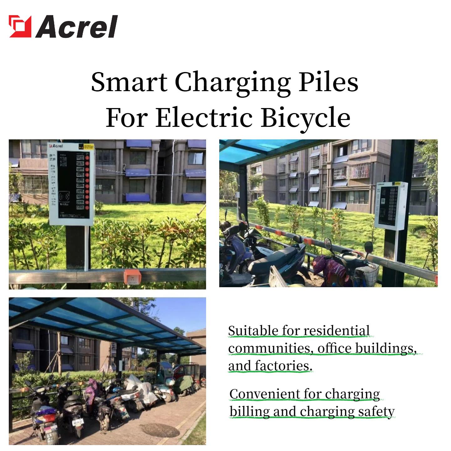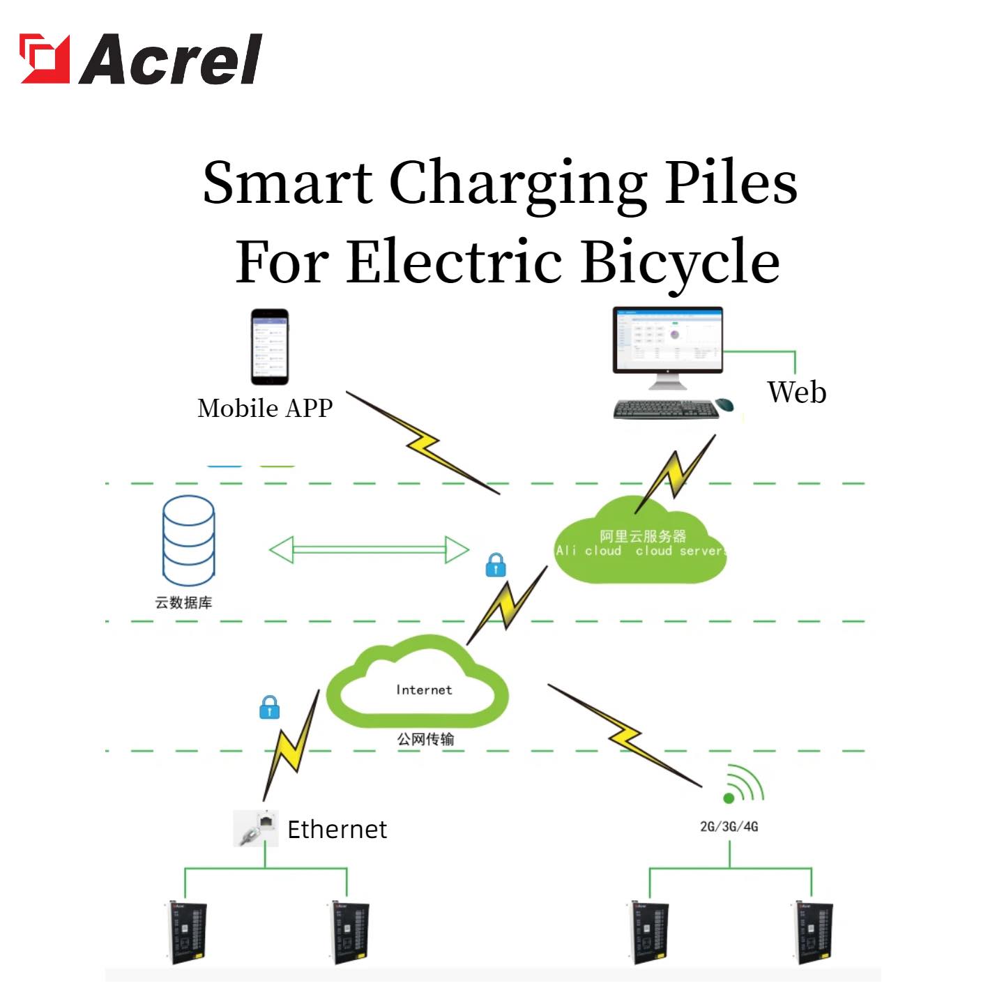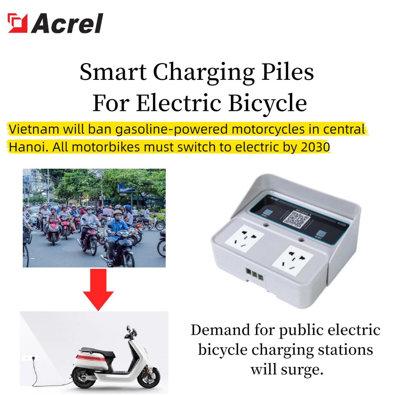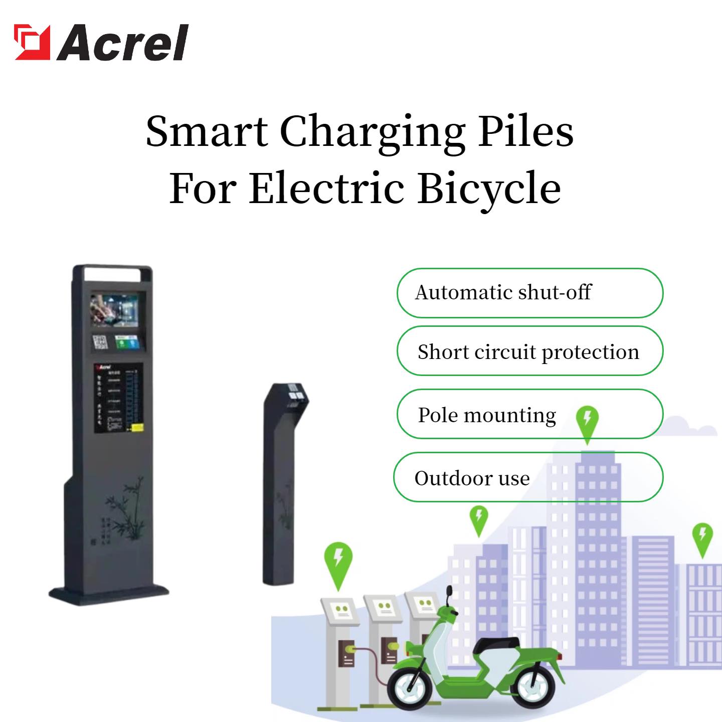 Acrels smart charging piles for electric bicycles a new generation of smart charging equipment for electric bicycles. It is an AC power supply device that integrates remote on/off control of AC output power, charging safety control, electricity metering, and time-based billing functions. This device can charge electric bicycles through the electric bicycle’s onboard charger.